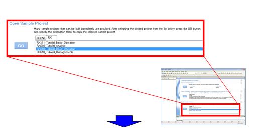 In the "Load Sample Project" field, from the "RX" tab, select "RX610_Tutorial_Basic_Operation", then click [GO]. |