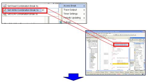 Right-click on the line including "g_count" in the Watch panel to select [Access Break] > [Set Write Break to] and enter the value 10.