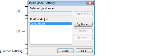 If the name of the build mode is changed to a name which is the same except for the use of upper- and lower-case characters, the destination for output will be the same as that for the existing build mode and the previously output file (such as *.abs) will be overwritten. We recommend that you do not specify a name for the build mode which is the same as that for an existing build mode except for the use of upper- or lower-case characters.
