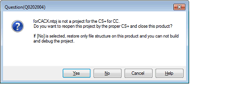 Click [Yes] to end "CS+ for CC" and start "CS+ for CA,CX" to load the project. Click [No] to load the project by "CS+ for CC" without changing the CS+. Click [Cancel] to halt loading. If [No] is clicked, though a project is loaded by "CS+ for CC", it cannot be built or debugged.