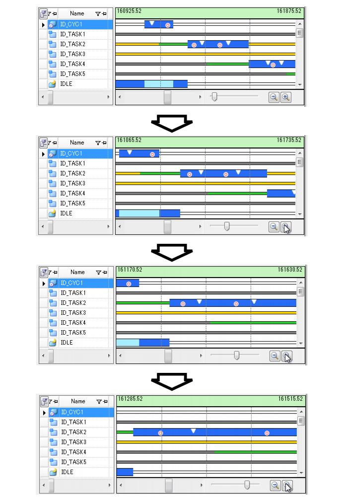 On the Analysis Result panel, you can zoom in or out the period of analysis information to be displayed as a processing program execution transition state or a real-time OS resource usage status, in the Analysis information diagram area.