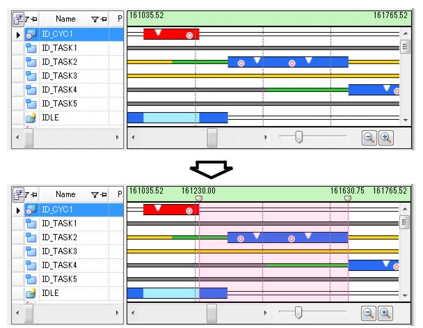 On the Analysis Result panel, by dragging and dropping with the mouse cursor in the Execution transition display area in the Analysis information diagram area, the user can change the analysis information to be displayed in the Analysis information table area from "analysis information in the trace data acquisition period" to "analysis information in the analysis information extraction interval".