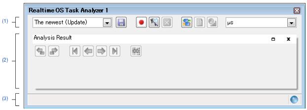 This panel displays the analysis information such as the execution transition state of the processing program, the state of real-time OS resource usage, and CPU usage status.