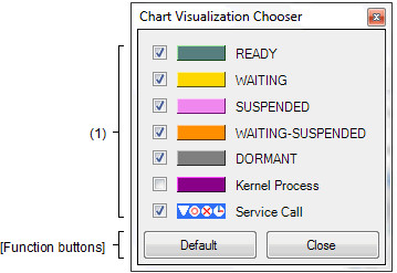 This dialog box specifies the type of state line to be displayed as an execution transition of the processing program, and whether an event mark is or is not to be displayed as a real-time OS resource usage status, in the Analysis information diagram area on the Analysis Result panel.