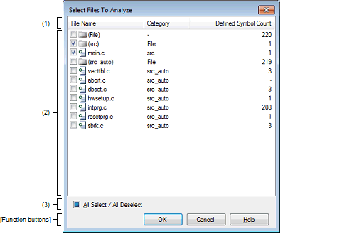 This dialog box is used to specify the files to be analyzed by the analysis tool (see "1.1.1What is analyzed").