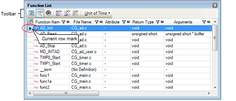 Note, however, that the function information in the files not to be analyzed is not displayed in this panel (see "1.1.1What is analyzed").