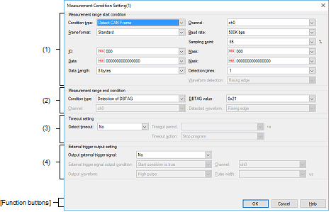 Select ch0 or ch1 as the channel number to be detected, that is, the number of the CAN channel or external trigger input channel depending on whether "Detect CAN Frame" or "Detect External Trigger Input Signal" has been selected for [Condition type].