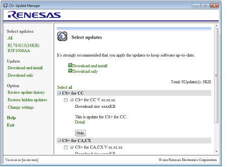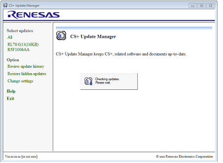 From the Windows the [Start] menu, select [Programs] >> [Renesas Electronics CS+] >> [Update Manager], or from the CS+ menu, select [Help] >> [Check for Updates...]. The CS+ Update Manager window launches.