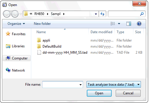 When selecting the [Open trace data....] on the drop-down list, select/specify the folder and the file in which the task analyzer trace data is stored, in the Open dialog box which is opened when the menu is selected.