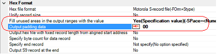 Select [Yes(Specification value)(-SPace=<Numerical value>)] in the [Fill unused areas in the output ranges with the value] property in the [Hex Format] category. The [Output padding data] property will be displayed.