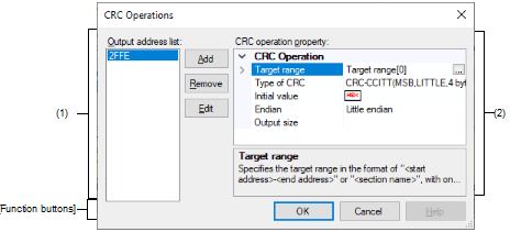 Specify the CRC calculation range in the format of "start address - end address" or "section name".