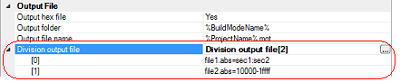 The setting of the hex file output range is made with the [Division output file] property in the [Output File] category.