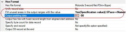 Select [Yes(Specification value)(-SPace=<Numerical value>)] in the [Fill unused areas in the output ranges with the value] property in the [Hex Format] category. The [Output padding data] property will be displayed.