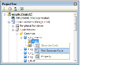 In the Code Generator, select [Project name (Project)] >> [Code Generator (Design Tool)] >> [Code Preview] >> Peripheral function node >> Source code node >> API function node in the Project Tree panel. “Setting That Determines Whether or Not to Generate Source Code” can be set in units of API functions by selecting “Generate Code/Not Generate Code” from the context menu, which is displayed by right clicking the mouse.