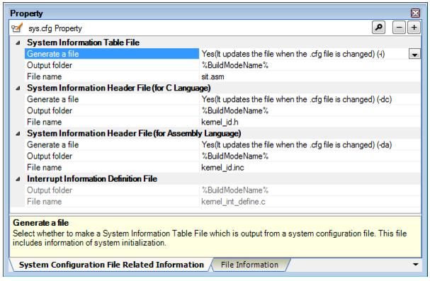 Select whether to generate a system information header file (for assembly language) and whether to update the file when the system configuration file is changed.