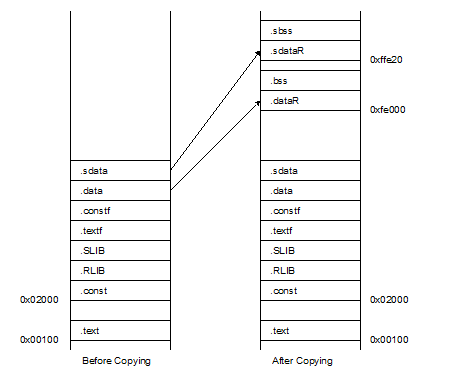 The section names .dataR and .sdataR to which data is to be copied can be different names but they need to match the code in the startup routine. At program execution, data is copied from .data to .dataR and from .sdata to .sdataR, and .bss and .sbss are initialized before they are used.