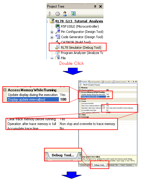 In the debugging tool's properties, set the display update interval [ms] to "100", and run the program as before. Next, Stop the program. |