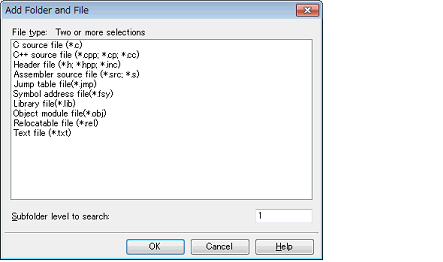 In the dialog box, select the types of the files to be added to the project and specify the number of levels of the subfolder to be added to the project. And then click the [OK] button.