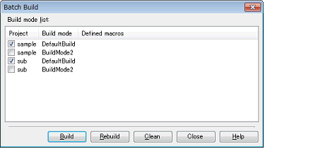 Select the check boxes for the combinations of the main project and subprojects and build modes that you wish to run a batch build, and then click the [Build], [Rebuild], or [Clean] button.