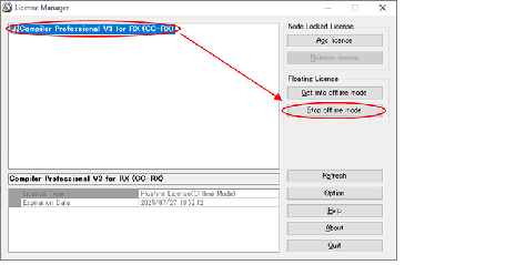 When the client is connected to the server, click on the license name and the [Stop offline mode] button in the License Manager window.