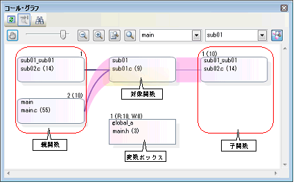 選択している関数([対象関数名]コンボ・ボックスで指定している関数)に対する親関数と子関数を表示する詳細表示にコール・グラフを切り替えます。