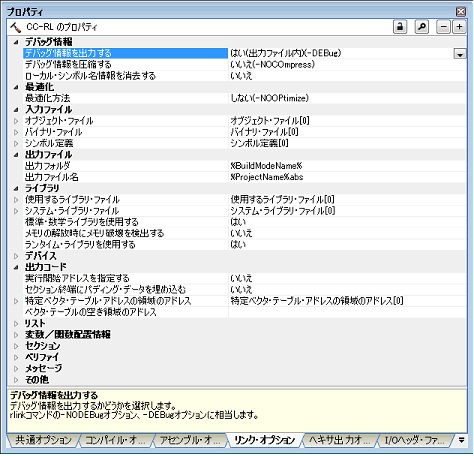 rlinkコマンドの-DEBUG_MONITORオプションに相当します。 なお,本プロパティは,[共通オプション]タブの[バージョン選択]カテゴリの[使用するコンパイラ・パッケージのバージョン]プロパティで[常にインストール済みの最新版]を選択し,インストールされている最新版がV1.01.00以上の場合,または[使用するコンパイラ・パッケージのバージョン]プロパティでV1.01.00以上を選択した場合に表示します。 |