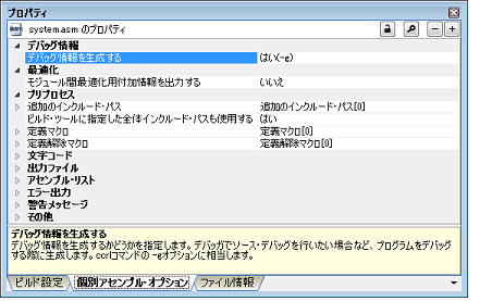 タブ上で必要なプロパティを設定することにより,アセンブリ・ソース・ファイルに対するアセンブル・オプションを設定することができます。