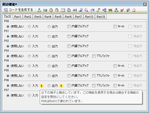 コード生成では,周辺機能 パネルにおける各種周辺機能の設定に伴い,端子の競合が発生する項目に対しては,競合が発生することを示す アイコンを該当箇所に表示し,端子の競合を警告します。