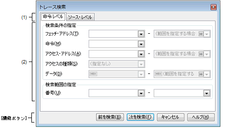 検索結果箇所をトレース パネル上で選択状態にします。 ただし,不正な値を指定している場合,またはプログラム実行中は,メッセージを表示し,トレース・データの検索は行いません。 また,トレース パネルが非表示の場合,または他のパネルにフォーカスがある状態からこのダイアログへフォーカスを移動した場合,このボタンは無効となります。 |