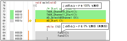 図 2.133 | コード・カバレッジ測定結果の表示例(エディタ パネル) |