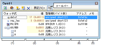 C言語変数,CPUレジスタ,SFR,およびアセンブラ・シンボルなどをウォッチ式として,次のウォッチ パネルに登録することにより,それらの値を常にデバッグ・ツールから取得し,一括して値を監視することができます。