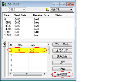 シリアル ウインドウでWait時間0のダミー設定を行ったのち,[自動送信]ボタンをクリックします。