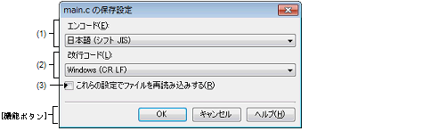 [これらの設定でファイルを再読み込みする]をチェックした場合,指定したエンコード,および改行コードを対象ファイルに設定し,ファイルを読み込み直したのち,このダイアログをクローズします。