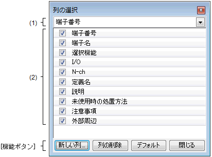 本ダイアログに表示されている項目を端子配置表に表示するか否かの選択,および端子配置表に対する列の翻訳追加/削除を行います。