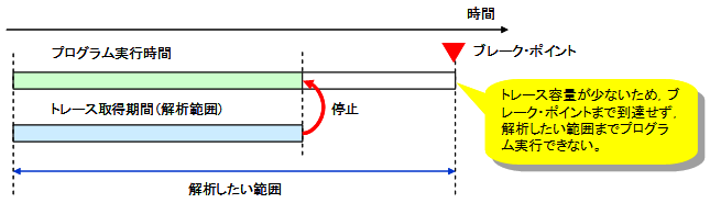 これは,下図に示すとおり,解析対象とする実行時間よりも,トレース取得期間が少ないことが原因となります。つまりトレース容量が少ないためです。