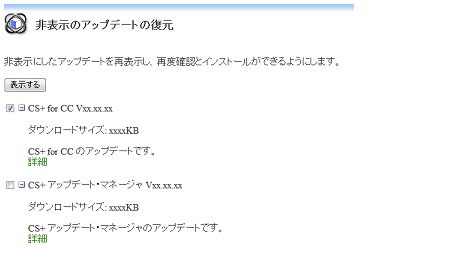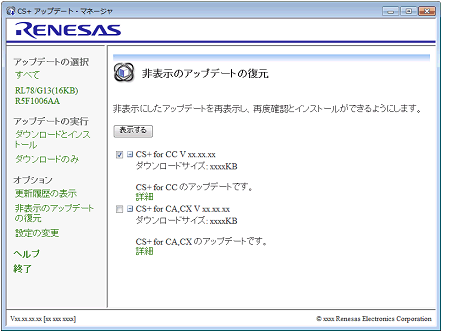 CS+ アップデート・マネージャ ウインドウのメニュー・エリアの[非表示のアップデートの復元]を選択すると,非表示のアップデートの復元 ページが表示されます。