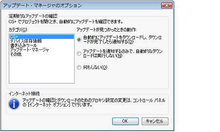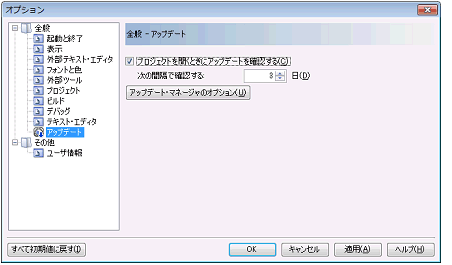 この機能は,オプション ダイアログの[全般 - アップデート]カテゴリで[プロジェクトを開くときにアップデートを確認する]をチェックし,[次の間隔で確認する]で設定した条件に一致した場合に実行されます。