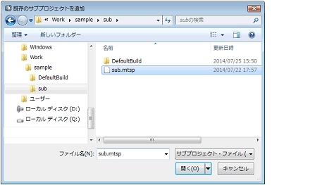 ダイアログ上で,追加するサブプロジェクトのサブプロジェクト・ファイルを指定し,[開く]ボタンをクリックしてください。