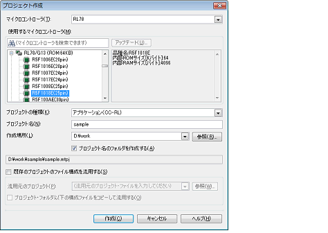 [使用するマイクロコントローラ]において,プロジェクトで使用するマイクロコントローラを選択します。