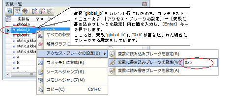 - | [アクセス・ブレークの設定]→[変数に読み書きブレークを設定]: リード/ライト・アクセスによるブレーク |