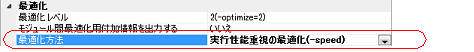 実行性能を優先した最適化を行うには,[最適化]カテゴリの[最適化方法]プロパティで[実行性能重視の最適化 (-speed)]を選択してください(デフォルトでは,[コード・サイズ重視の最適化 (-size)]が選択されています)。