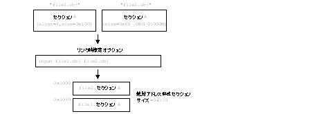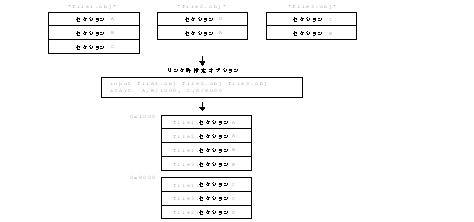 最適化リンケージエディタでは、入力リロケータブルファイル内の同一セクションを結合し、startオプションによって指定されたアドレスに割り付けます。