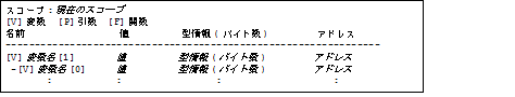 なお,配列,ポインタ型変数,構造体/共用体,CPUレジスタ(部分を表す名前が付与されているもののみ)を展開表示している場合では,各展開要素の値も保存されます。展開表示していない場合は,先頭に“+”マークが付与され,値は空欄となります。