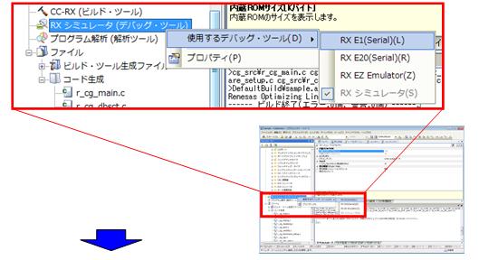 プロジェクト・ツリーのデバッグ・ツール上で右クリックして,[使用するデバッグ・ツール]→[RX E1(Serial)]を選択してください。