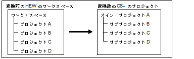 HEWのプロジェクトは,ワークスペース・ファイルに記載されているプロジェクト間の依存関係に応じて,メイン・プロジェクト,またはサブプロジェクトに変換されます。