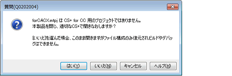 CS+ for CCを終了しCS+ for CA,CXを起動して読み込む場合は[はい],そのままCS+ for CCで読み込む場合は[いいえ],読み込みを中止する場合は[キャンセル]をクリックしてください。[いいえ]をクリックした場合,CS+ for CCで読み込みますがビルドやデバッグはできません。