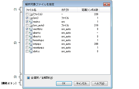各項目のチェック・ボックスの指定により,解析対象とするファイルを設定することができます。
