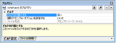 なお,本プロパティは,プロジェクト・ツリーでアセンブリ・ソース・ファイルを選択し,本タブの[ビルドの対象とする]プロパティで[はい]を選択した場合のみ表示します。