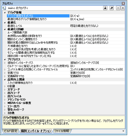 タブ上で必要なプロパティを設定することにより,Cソース・ファイルに対するコンパイル・オプションを設定することができます。