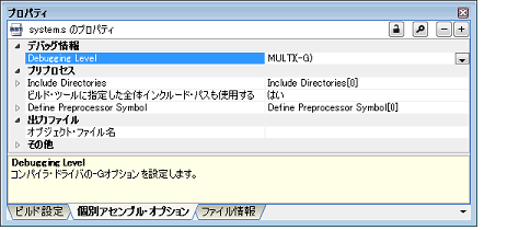 本タブでは,1つのアセンブリ・ソース・ファイルに対して,次に示すカテゴリごとに詳細情報の表示,および設定の変更を行います。